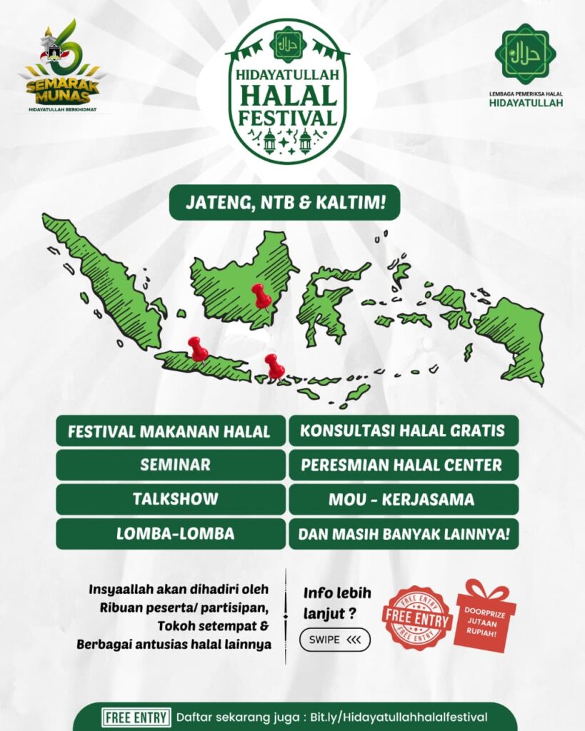 Hidayatullah Halal Festival dijadwalkan berlangsung selama beberapa hari pada bulan September 2025 dengan agenda antara lain: seminar halal, workshop penyembelihan sesuai syariah, bazar UMKM halal, serta layanan sertifikasi halal gratis bagi pelaku usaha mikro.