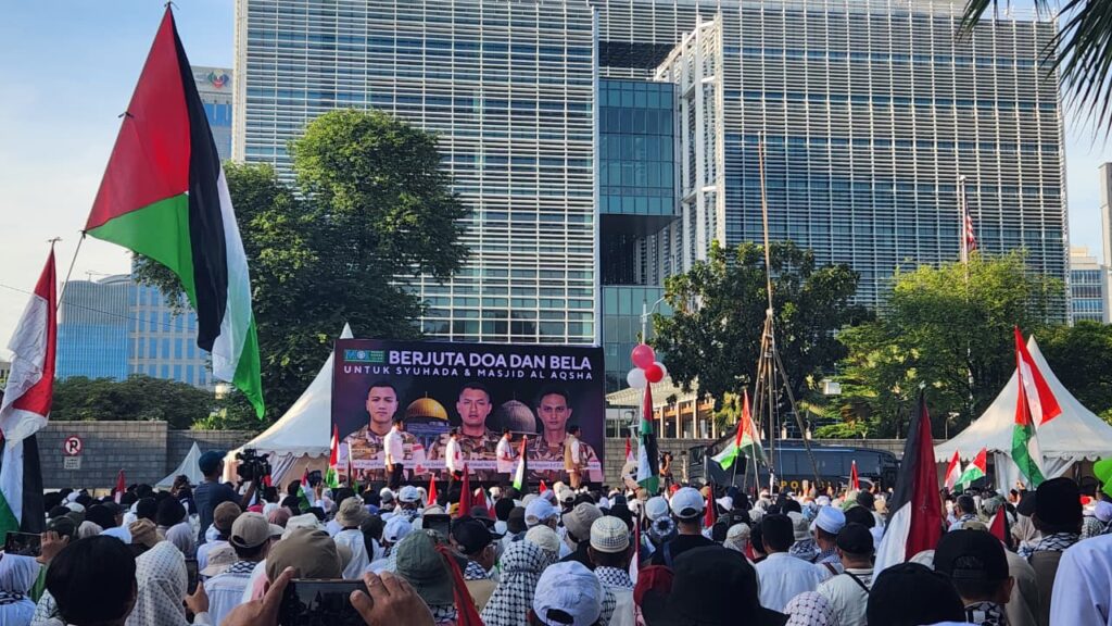 Seruan ajakan itu disampaikan Naspi di hadapan massa Aksi Damai untuk Solidaritas Palestina diinisiasi oleh Majelis Ormas Islam (MOI) ini mengusung tema Berjuta Doa dan Bela untuk Syuhada & Masjidil Al Aqsha yang digelar di depan Kedutaan Besar Amerika Serikat pada Ahad, 16 Syawal 1447 (5/4/2026).