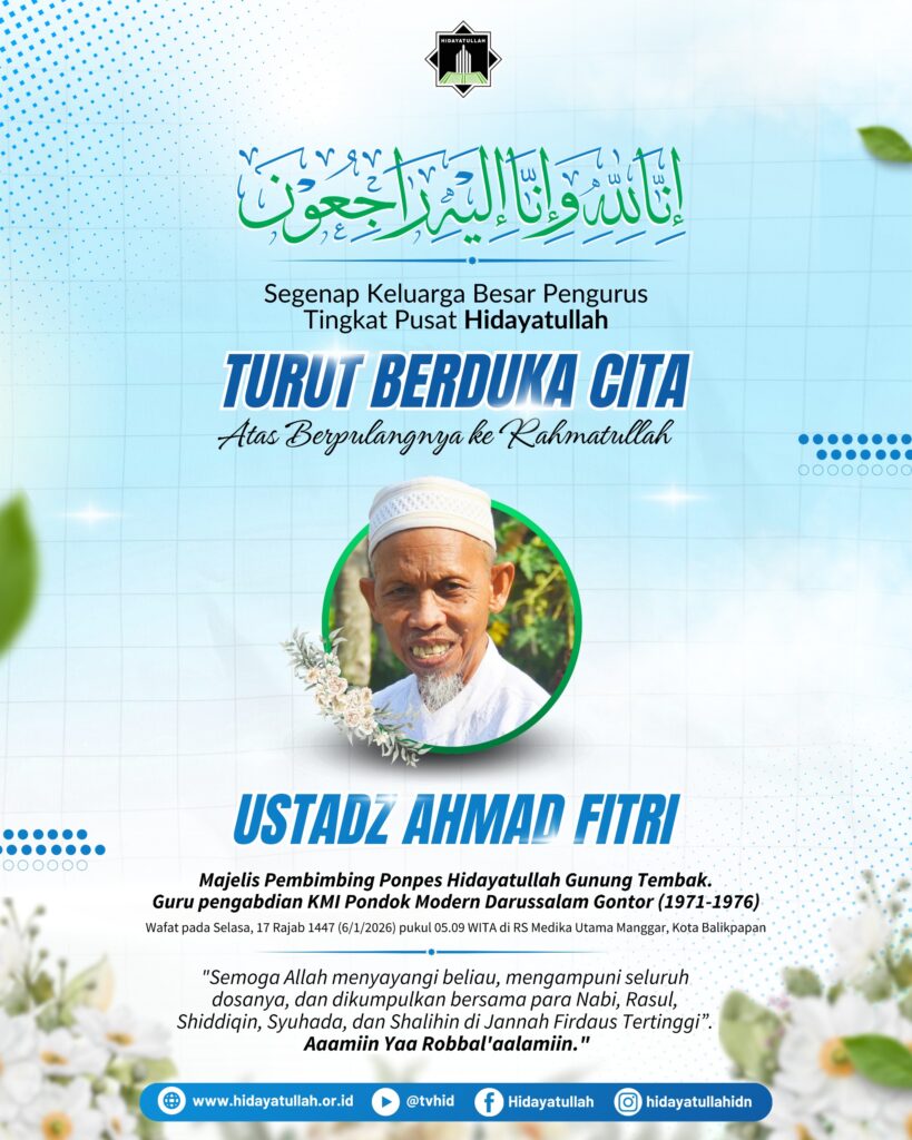 BALIKPAPAN (Hidayatullah.or.id) — Keluarga besar Hidayatullah berduka atas meninggalnya Ustadz Ahmad Fitri, salah satu pendidik dan dai senior Kampus Induk Pondok Pesantren Hidayatullah Gunung Tembak. Beliau wafat pada Selasa, 17 Rajab 1447 (6/1/2026) pukul 05.09 WITA di RS Medika Utama Manggar, Kota Balikpapan.